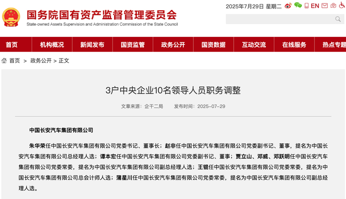 此外,贾立山、邓威、邓跃明任中国长安汽车集团有限公司党委常委,提名为中国长安汽车集团有限公司副总经理人选;王锟任中国长安汽车集团有限公司党委常委,提名为中国长安汽车集团有限公司总会计师人选;蒲星川任中国长安汽车集团有限公司党委常委,提名为中国长安汽车集团有限公司副总经理人选。