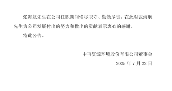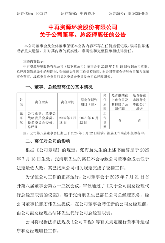 7月21日,中再资环发布公告称,公司董事会于7月18日收到公司董事、总经理张海航先生的辞职书,张海航先生因工作调整原因,向公司董事会请辞公司第八届董事会董事、战略委员会委员和提名委员会委员及公司总经理职务。