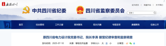 原四川省电力设计院党委书记、院长李涛涉嫌严重违纪违法,目前四川省纪委监委驻水利厅纪检监察组正对其进行纪律审查,经四川省监委指定攀枝花市监委管辖,攀枝花市监委正对其进行监察调查。