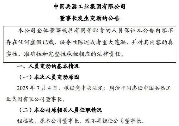 7月8日,中国兵器工业集团有限公司(以下简称“兵工集团”)发布公告称,7月4日,根据党中央决定:周治平任中国兵器工业集团有限公司董事长,程福波不再担任公司董事长。