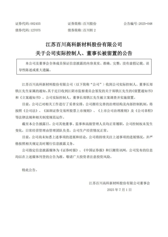 7月2日,百川股份发布公告称,公司收到实际控制人、董事长郑铁江家属的通知,其于近日收到江阴市监察委员会签发的关于郑铁江的《留置通知书》和《立案通知书》,郑铁江被立案调查并实施留置。