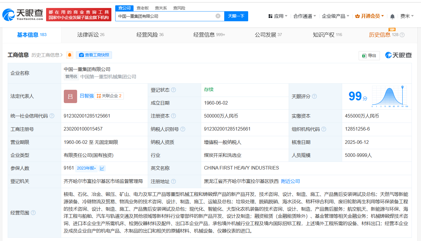 天眼查App显示,近日,中国一重集团有限公司发生工商变更,徐鹏卸任法定代表人、董事长,由吕智强接任,同时部分高管发生变更。