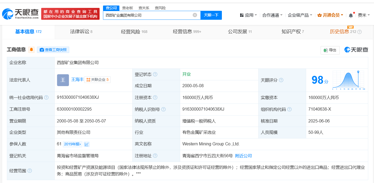 天眼查App显示,近日,西部矿业集团有限公司发生工商变更,张永利卸任法定代表人、董事长,由王海丰接任,同时部分高管发生变更。