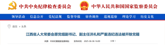 中央纪委国家监委网站6月6日消息,经中共中央批准,中央纪委国家监委对江西省人大常委会原党组副书记、副主任洪礼和严重违纪违法问题进行了立案审查调查。