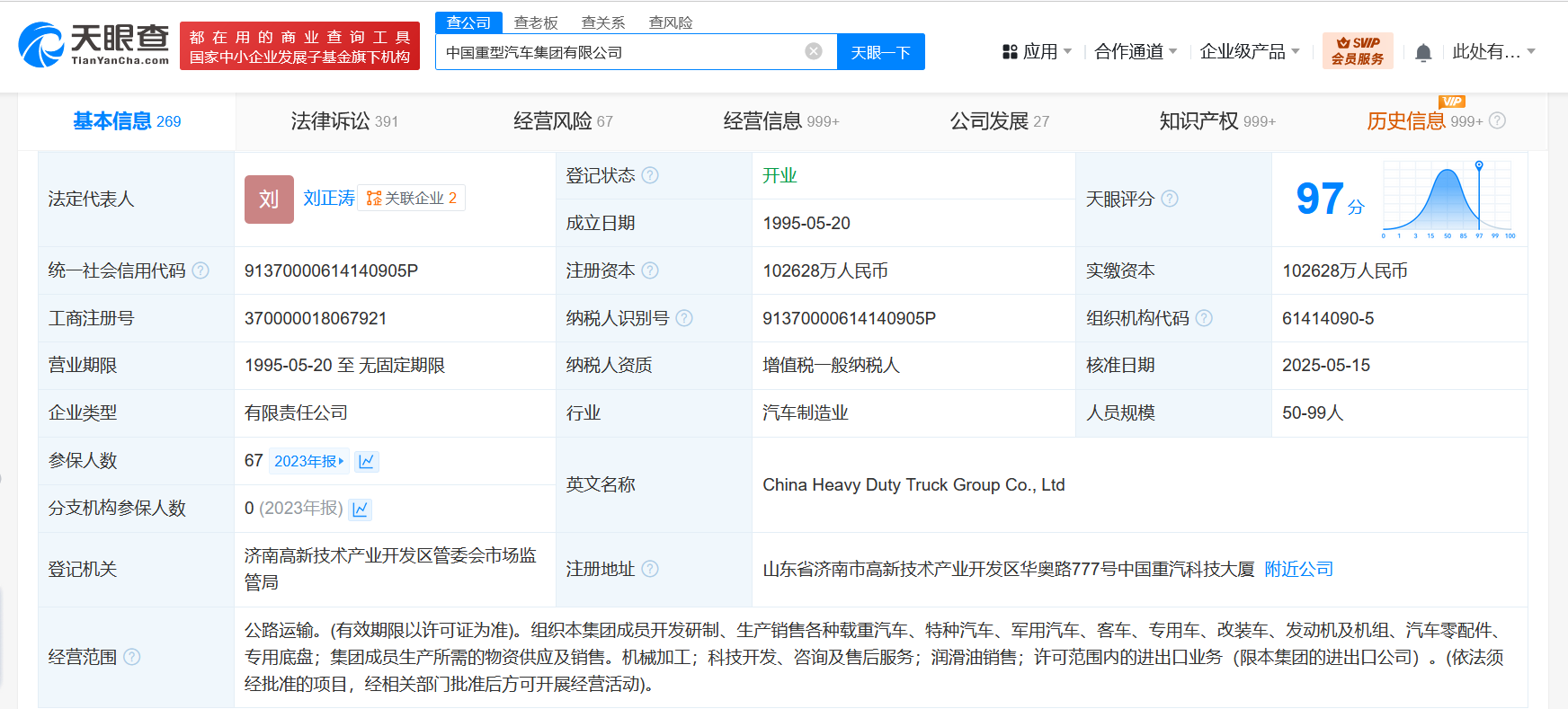 中国重型汽车集团有限公司成立于1995年5月,注册资本约10.26亿人民币,经营范围含公路运输,组织本集团成员开发研制、生产销售各种载重汽车、特种汽车、军用汽车、客车、专用车、改装车、发动机及机组、汽车零配件、专用底盘,集团成员生产所需的物资供应及销售等。股东信息显示,该公司由山东重工集团有限公司、济南市人民政府国有资产监督管理委员会分别持股65%、35%。
