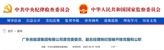 中央纪委国家监委网站5月7日消息,据广东省纪委监委消息:经广东省委批准,广东省纪委监委对广东省能源集团有限公司原党委委员、副总经理姚纪恒严重违纪违法问题进行了立案审查调查。