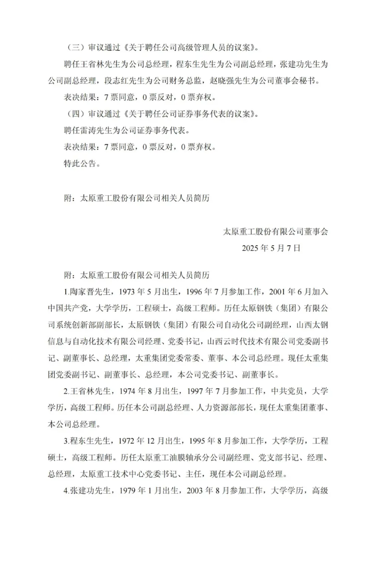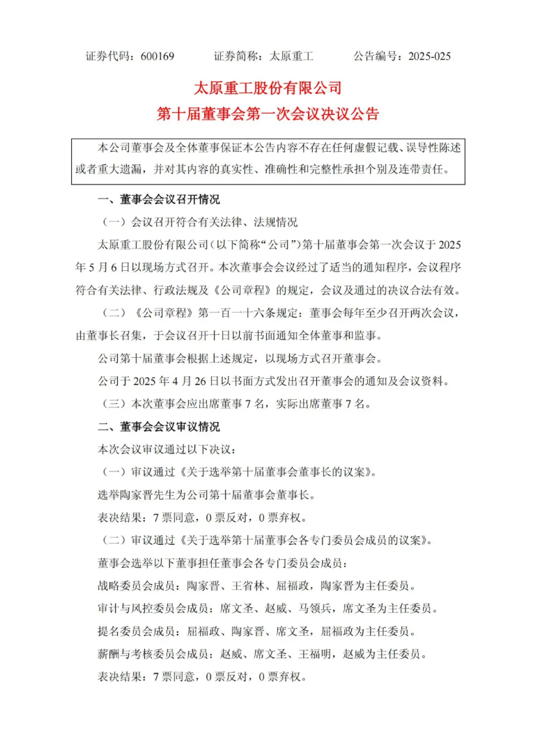 5月7日,太原重工发布公告,公司董事会审议通过《关于选举第十届董事会董事长的议案》,选举陶家晋先生为公司第十届董事会董事长;审议通过《关于选举第十届董事会各专门委员会成员的议案》。