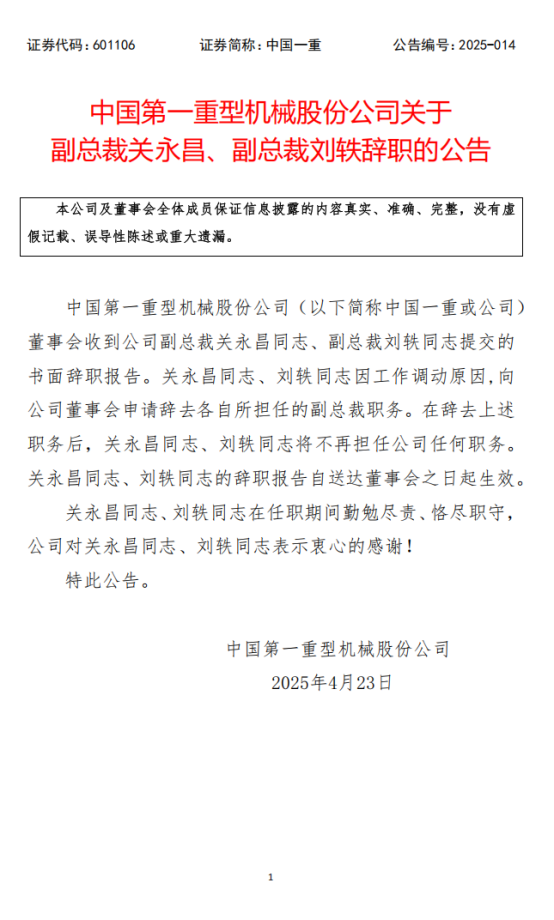 中国一重4月22日公告,公司董事会收到副总裁关永昌、副总裁刘轶的书面辞职报告,关永昌、刘轶因工作调动原因,申请辞去各自所担任的副总裁职务。在辞去上述职务后,关永昌、刘轶将不再担任公司任何职务。关永昌、刘轶的辞职报告自送达董事会之日起生效。