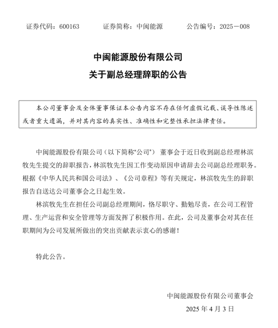 4月3日,中闽能源发布公告称,公司董事会收到副总经理林滨牧的辞职报告,林滨牧因工作变动原因辞去公司副总经理职务。根据相关规定,辞职报告自送达公司董事会之日起生效。