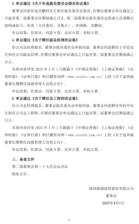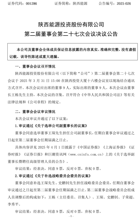 3月31日,陕西能源召开董事会,审议通过《关于选举公司副董事长的议案》。董事会同意选举董事王琛先生担任公司副董事长,任期自董事会审议通过之日起至第二届董事会任期届满之日止。