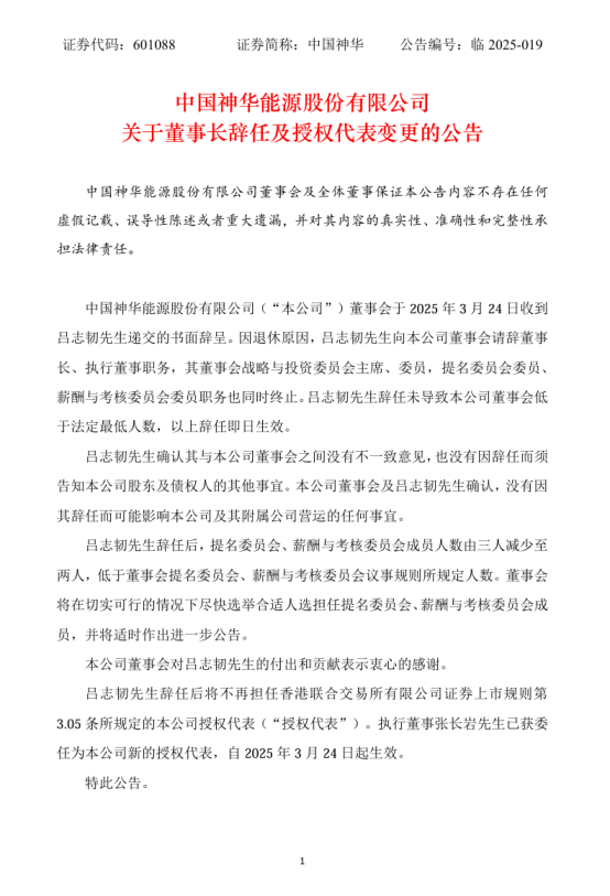 3月25日,中国神华发布公告称,公司董事会于3月24日收到吕志韧先生递交的书面辞呈。因退休原因,吕志韧先生向本公司董事会请辞董事长、执行董事职务,其董事会战略与投资委员会主席、委员,提名委员会委员、薪酬与考核委员会委员职务也同时终止。