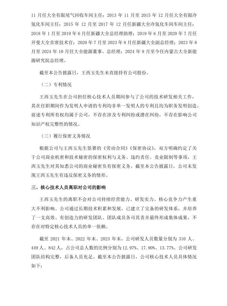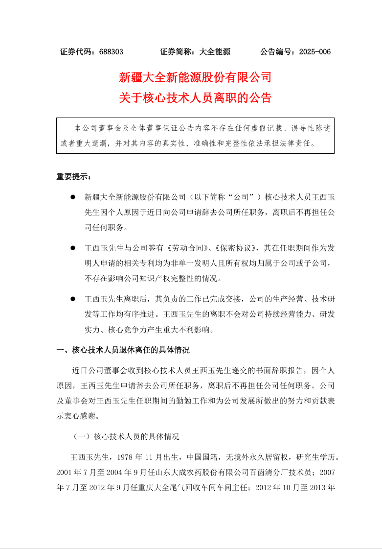 3月17日,大全能源发布公告称,公司核心技术人员马晓亮与公司签订的劳动合同于2025年3月2日到期。合同到期后,马晓亮先生因个人原因不再与公司续签劳动合同,并于近日办理完毕离职手续。马晓亮离职不会对公司持续经营能力、研发实力、核心竞争力产生重大不利影响。