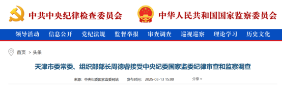 中央纪委国家监委网站3月13日消息,天津市委常委、组织部部长周德睿涉嫌严重违纪违法,目前正接受中央纪委国家监委纪律审查和监察调查。
