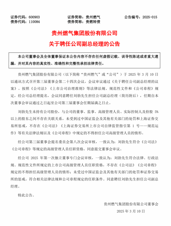 贵州燃气发布公告称,公司于3月10日以通讯方式召开第三届董事会第二十四次会议,会议审议通过《关于聘任公司副总经理的议案》。按照《公司法》《上市公司治理准则》等法律法规、规范性文件和《公司章程》规定,经公司总经理提名,会议同意聘任刘勃先生担任公司副总经理。
