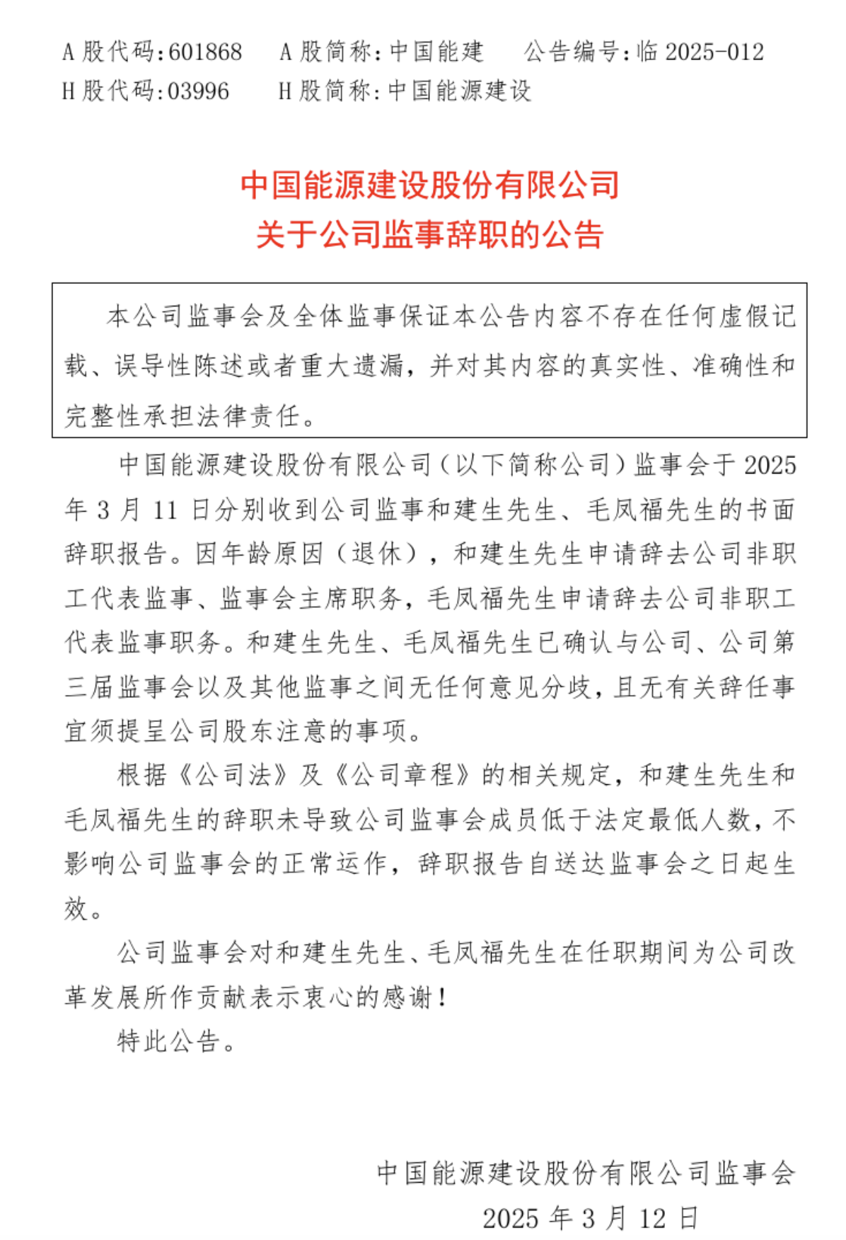 中国能建发布公告称,公司监事会于3月11日分别收到公司监事和建生先生、毛凤福先生的书面辞职报告。因年龄原因(退休),和建生先生申请辞去公司非职工代表监事、监事会主席职务,毛凤福先生申请辞去公司非职工代表监事职务。