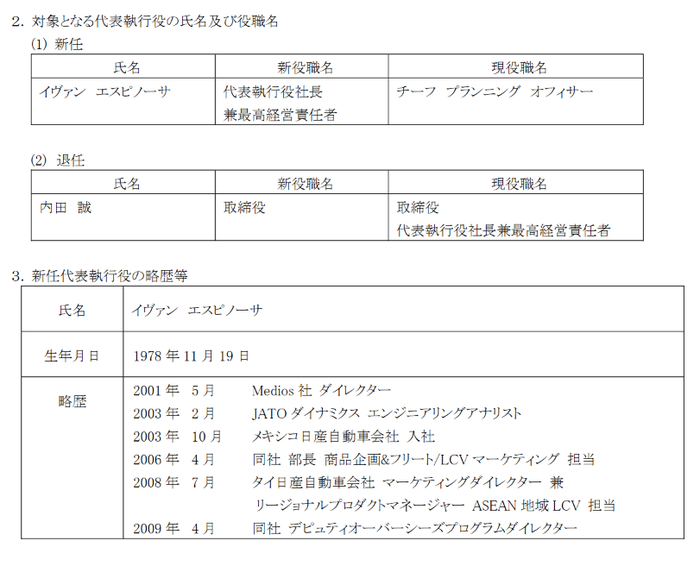 日产汽车3月11日宣布,公司当日召开董事会会议,决定社长内田诚将于3月底卸任,继任者为公司首席规划官伊万·埃斯皮诺萨(Ivan Espinosa),4月1日起生效。