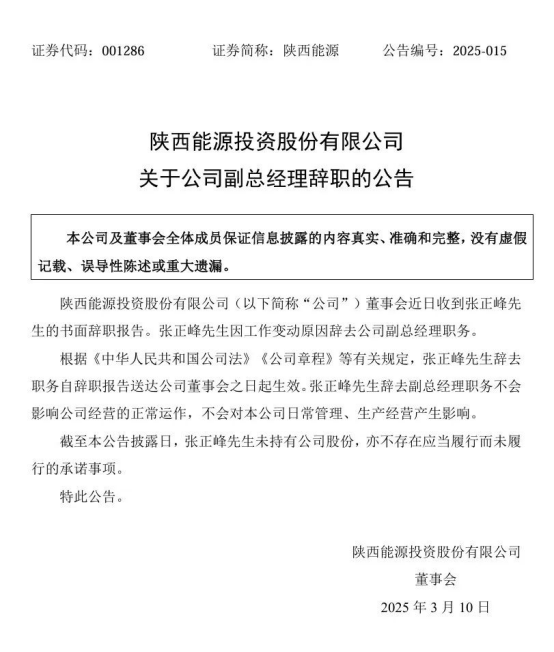 3月10日,陕西能源发布公告称,董事会近日收到张正峰先生的书面辞职报告。张正峰先生因工作变动原因辞去公司副总经理职务。