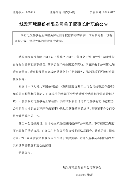 3月6日,城发环境发布公告称,公司董事会于近日收到公司董事长白洋先生的书面辞职报告。董事长白洋先生因工作变动,申请辞去本公司第七届董事会董事、董事长及董事会战略委员会主任委员职务,且辞职后不再担任公司任何职务。