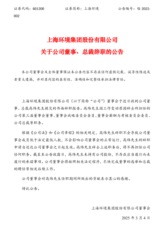 3月4日,上海环境发布公告称,公司董事会于近日收到公司董事、总裁高炜先生提交的书面辞职报告。高炜先生因工作变动原因辞去所担任的公司第三届董事会董事、董事会战略委员会委员、董事会薪酬与考核委员会委员、公司总裁等职务。