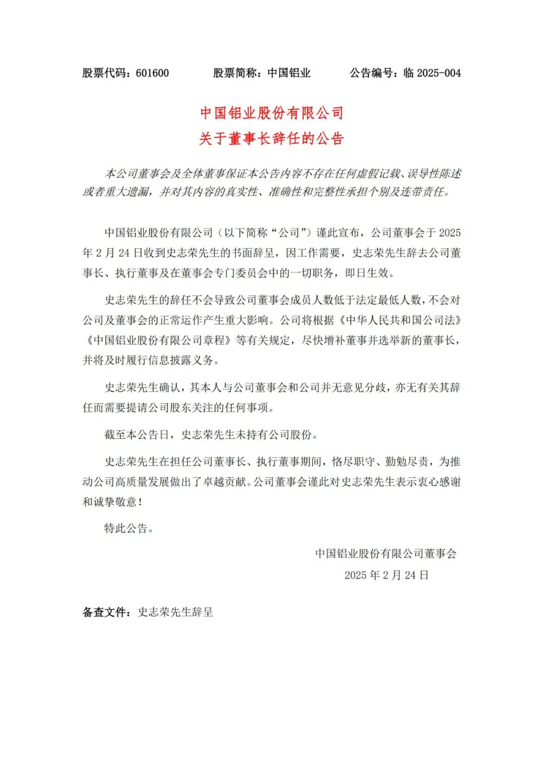 中国铝业股份有限公司发布公告,公司董事会于2月24日收到史志荣先生的书面辞呈,因工作需要,史志荣先生辞去公司董事长、执行董事及在董事会专门委员会中的一切职务,即日生效。