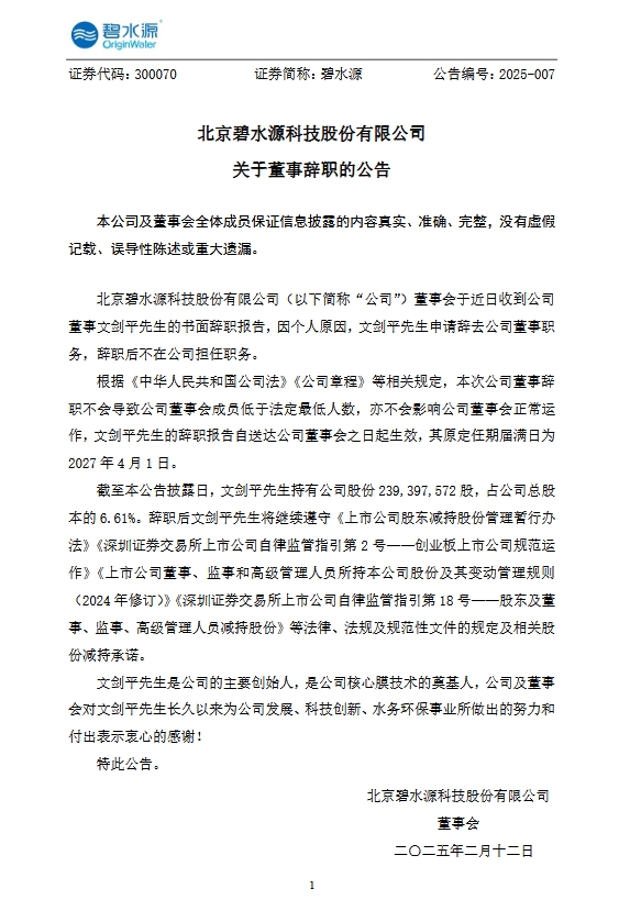 碧水源近日发布公告,公司董事会于近日收到公司董事文剑平先生的书面辞职报告,因个人原因,文剑平先生申请辞去公司董事职务,辞职后不在公司担任职务。