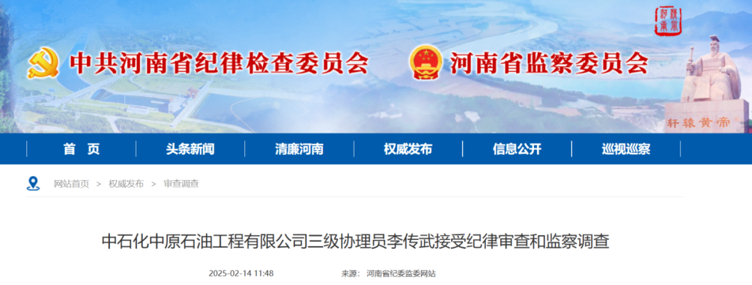 据中国石化纪检监察组和河南省濮阳市清丰县纪委监委消息:中石化中原石油工程有限公司三级协理员李传武涉嫌严重违纪违法,目前正接受中国石化纪检监察组纪律审查和河南省濮阳市清丰县监察委员会监察调查。