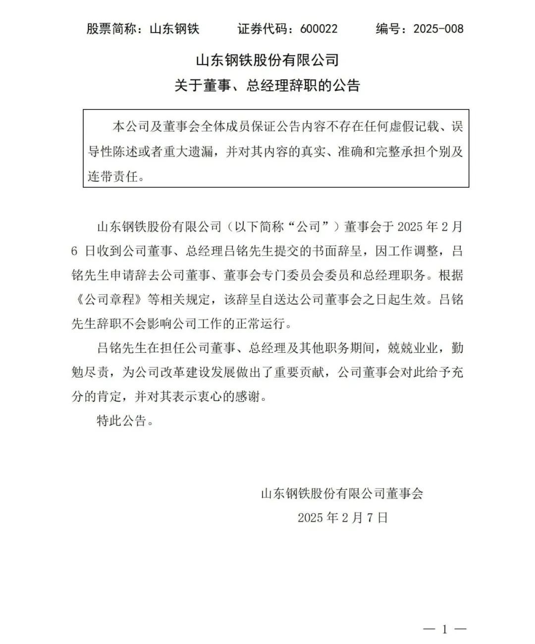 山东钢铁发布公告,公司董事会于2025年2月6日收到公司董事、总经理吕铭先生提交的书面辞呈,因工作调整,吕铭先生申请辞去公司董事、董事会专门委员会委员和总经理职务。根据《公司章程》等相关规定,该辞呈自送达公司董事会之日起生效。吕铭先生辞职不会影响公司工作的正常运行。