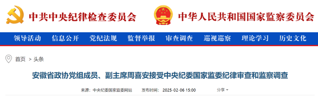 中央纪委国家监委网站2月6日消息,安徽省政协党组成员、副主席周喜安涉嫌严重违纪违法,目前正接受中央纪委国家监委纪律审查和监察调查。