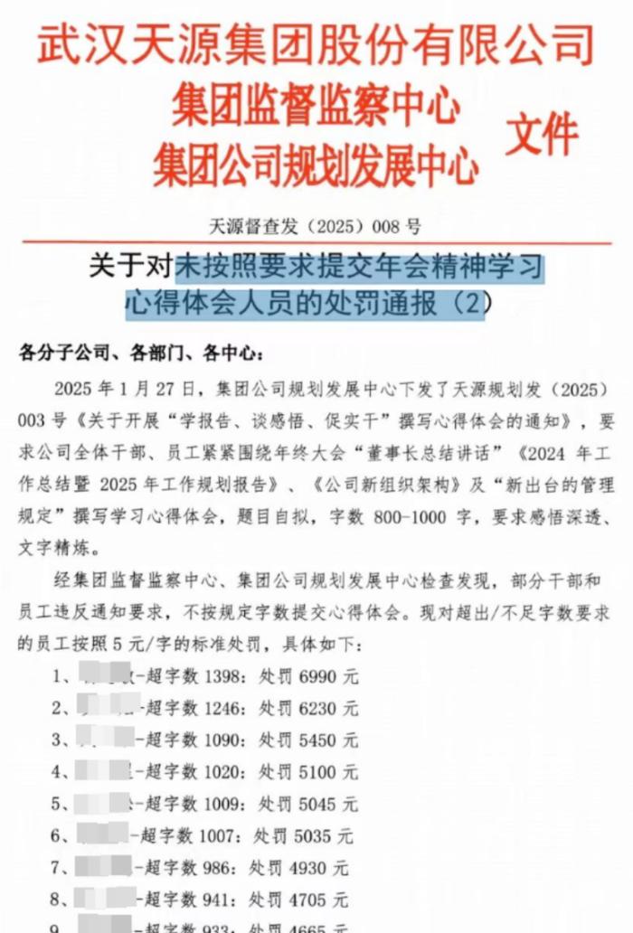 该通报显示,2025年1月27日,天源环保集团公司规划发展中心要求全体干部、员工围绕年终大会“董事长总结讲话”等内容撰写800-1000字学习心得体会。经检查,部分人员未按规定字数提交,公司决定对超出或不足字数的员工按5元/字处罚。在381人的处罚名单中,最高超1398字,原处罚6990元,后按“教育为主、惩前毖后”原则,超出200元统一按200元标准执行;最低超字或少字不足10字,处罚15-50元不等。处罚将从2025年2月份工资中扣除。
