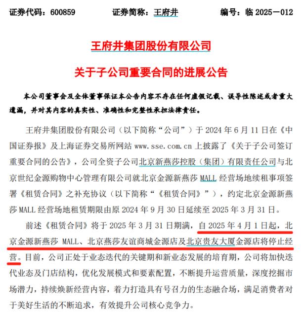 该商场由王府井(600859.SH)全资子公司北京新燕莎控股(集团)有限责任公司旗下的北京新燕莎商业负责运营管理。新燕莎MALL的租赁合同原定于2024年9月30日到期,后通过补充协议延长至2025年3月31日,如今补充协议到期,双方未能就续租达成一致,自2025年4月1日起,北京金源新燕莎MALL、北京燕莎友谊商城金源店及北京贵友大厦金源店都将停止经营。
