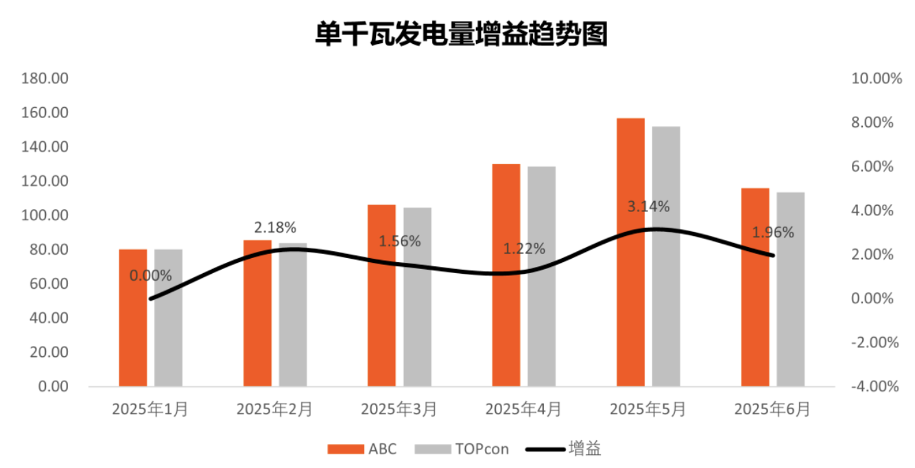 该项目在一工商业屋顶上安装了ABC双玻640W组件和TOPCon双玻615W组件各一串,倾角均为5°,统一采用直流侧数据,对组件在相同运行条件下的发电性能进行对比验证。今年1月至6月,共计164天的实证周期内,ABC组件累计单千瓦发电量674.96kWh/kWp,累计单位面积发电量159.92kWh/m²,较TOPCon组件分别高出1.81%和5.95%。