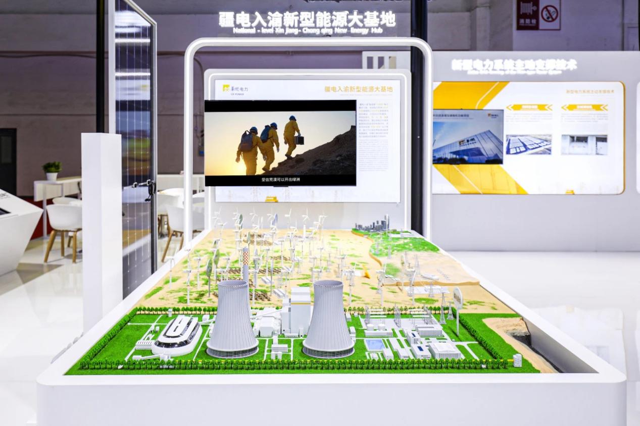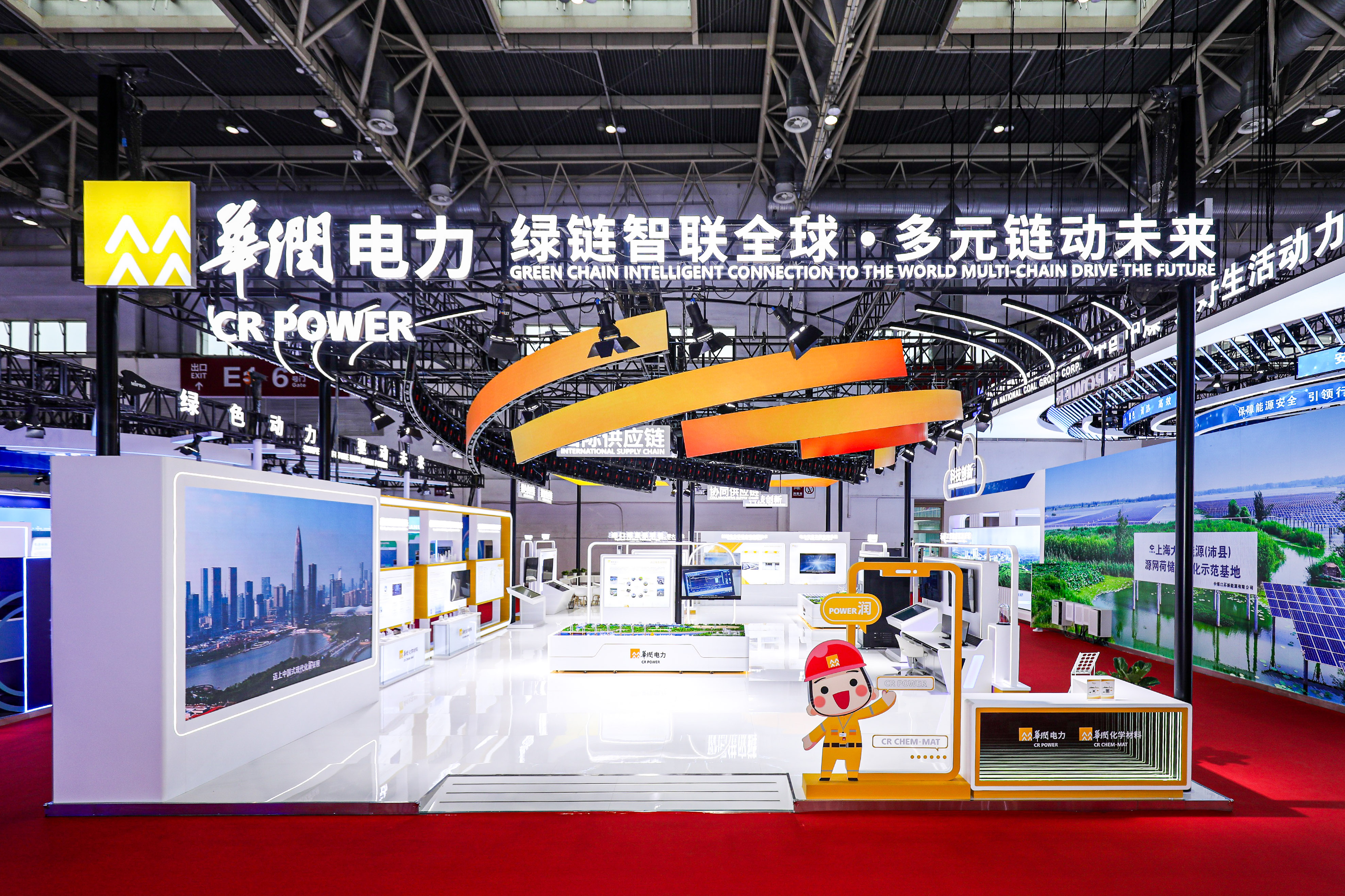 本届博览会华润电力展示主题是“绿链智联全球 多元链动未来”,展位面积250平方米,设计理念是“能源转型,绿能新生”,通过“能源转型”轮和“绿能新生”链,构建传统能源与清洁能源的动态转型平衡造型,聚焦二者在转型中的协同共生,以及“绿能新生”的无限可能。