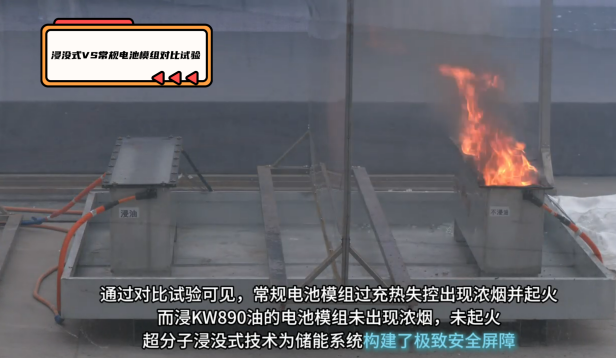 (通过浸没超分子浸没油和常规未浸油的电池模组过充热失控测试,验证超分子浸没技术对电池热失控的抑制效果)