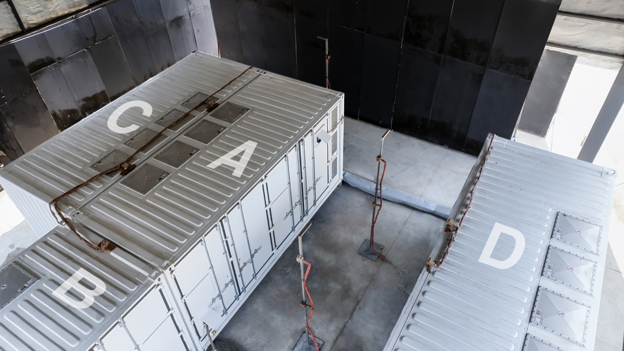 本次测试严格按照场站真实场景设计,ABCD箱4组远景智慧交易型储能系统,单箱容量5MWh,现场充电至100%SOC,物理屏蔽消防系统,燃烧全过程0干预。