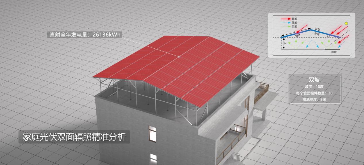 值得一提的是,iSolarSim还可以支持家庭场景能支持人字坡单/双面发电仿真、山体阴影计算等,这也是针对中国家庭光伏市场特点进行专门优化的功能。其中,人字坡双面仿真是iSolarSim独有支持的,通过将传统二维无限长的仿真模型升维至三维有限面积的仿真模型,通过构建屋面与光伏阵列之间的能量传递路径,家庭双面坡屋顶场景仿真精度可提升超2%。