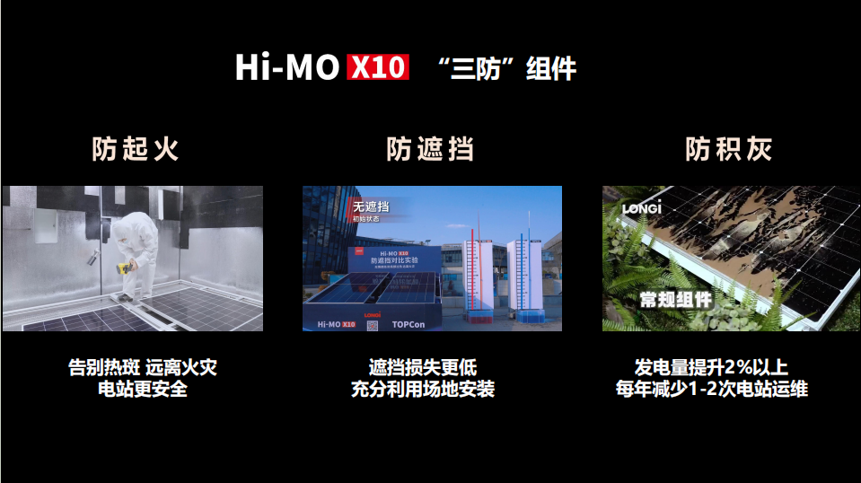作为全球唯一一款Hi-MO X10“三防”光伏组件,它是如何解决“起火、热斑、积灰”三大场景痛点的呢?