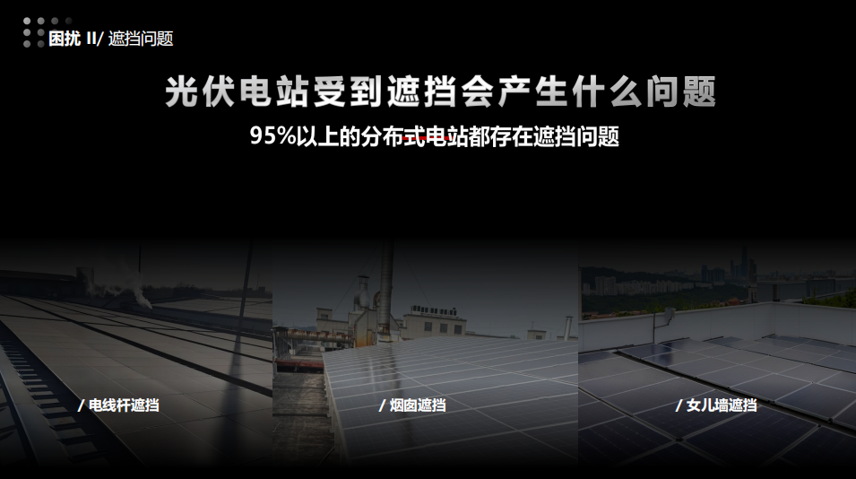 三是遮挡现象。以工商业场景为例,存量市场的优质屋顶越来越少,大部分屋顶都存在一定的遮挡现象,这些遮挡不一定是大面积的遮挡,有可能是周围的高楼、树木、鸟粪、积灰等各类遮挡现象,但是,即使是这些小遮挡,也会对组件产生大危害,是导致组件出现热斑、影响发电和组件起火的主要原因。