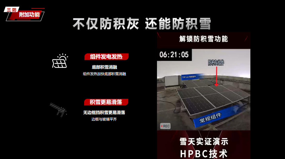 自从2023年10月,隆基在全球首次发布BC“防积灰”技术以来,解决了困扰分布式光伏市场多年的积灰问题,不但降低了组件运维清洗成本,而且还有效阻止了“热斑”现象。在北方地区,防积灰功能还延伸出“防积雪”功能,能够有效将组件表面的积雪自行清除,确保电站安全和屋顶安全。