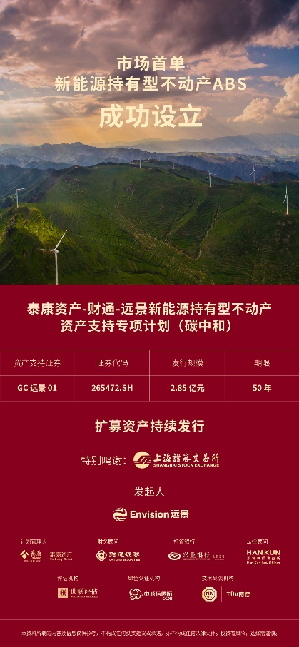 6月17日,泰康资产-财通-远景新能源持有型不动产资产支持专项计划(下称“专项计划”)在上海证券交易所成功发行,总规模2.85亿元。作为市场首单以平价风电场为底层资产的持有型不动产资产支持证券(ABS),该专项计划的成功发行不仅标志着风电资产证券化迈出关键一步,也为有绿色电力和ESG需求的企业提供了创新解决方案。