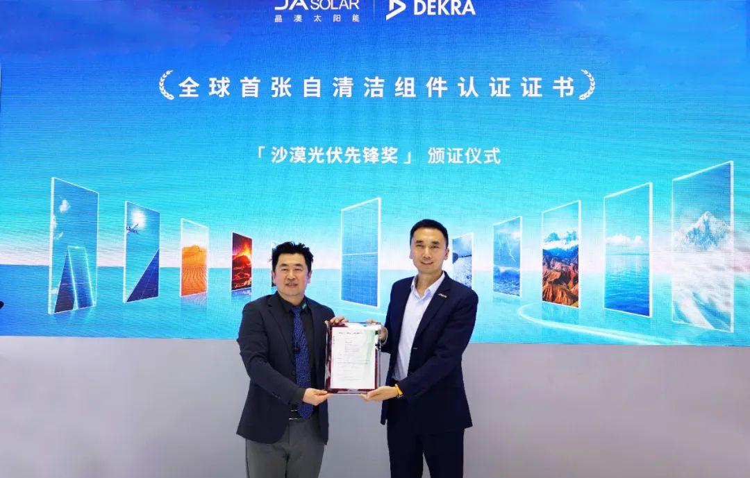 与此同时,同样是全球首张,国际知名认证机构DEKRA德凯同期为晶澳科技颁发了“自清洁光伏组件认证”证书。在IEC 60068-2-68 La1国际标准灰尘条件下,采用晶澳科技自清洁技术的组件产品实测反射率损失较常规双镀组件减少达5%。这意味着无论是在以沙漠为代表的强沙尘环境中,还是在普通应用场景中,晶澳都可以进一步帮助客户强化降本增效,一个自清洁光伏组件批量应用的时代即将到来。