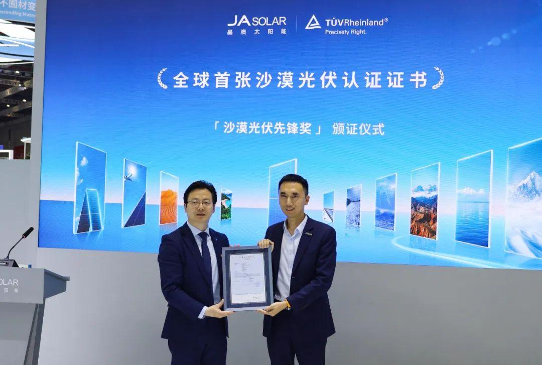 晶澳科技作为“全场景”解决方案的领军者,已率先向这项全新认证标准发起挑战,并顺利通过所有测试项目。在展会现场,TÜV莱茵全球电力电子产品服务副总裁兼大中华区太阳能与商业产品服务总经理李卫春亲手为晶澳科技颁发了全球首张“沙戈荒光伏组件认证”证书,彰显了晶澳科技对于沙漠应用场景的强大掌控能力。