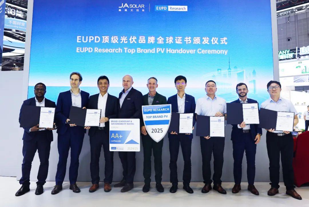 展会现场,EUPD Research首席客户官Daniel Fuchs为晶澳科技颁发了欧洲、非洲、拉丁美洲、中东北非、东南亚及澳大利亚六大区域的“顶级光伏品牌”认证,这是晶澳科技在这六大地区当地市场获得认可和声望的最佳注脚。截至目前,晶澳科技累计获颁EUPD“2025年顶级光伏品牌”荣誉已达20余个,稳居行业前列。
