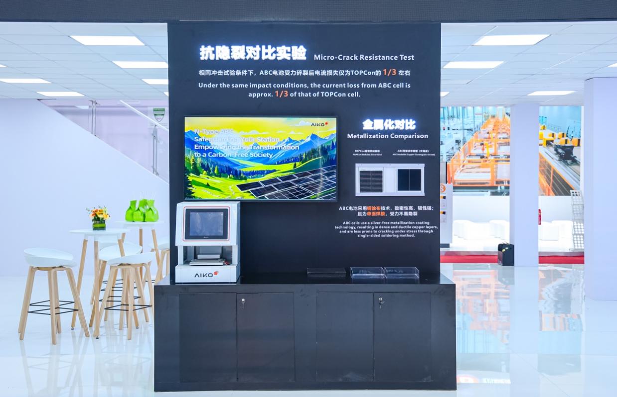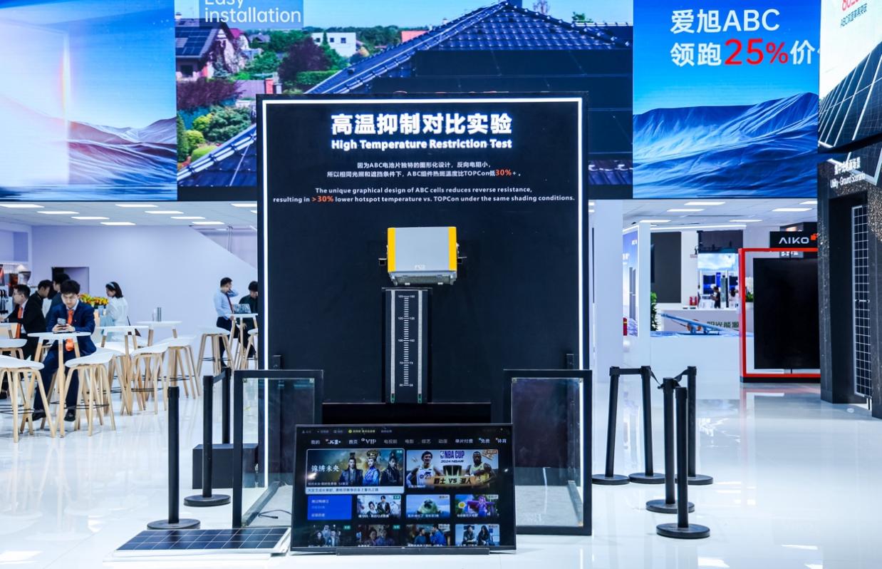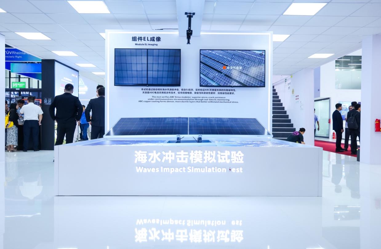 与产品矩阵一同焕新升级的,还有一系列别出心裁的演示实验:海水冲击模拟实验、高温抑制对比实验、抗隐裂性能对比实验、阴影发电优化对比实验、金属化工艺对比、智能组件功能演示……科学、直观地解析爱旭ABC组件在复杂工况下,仍能保持高效稳定发电、为用户电站利益保驾护航的独特优势。