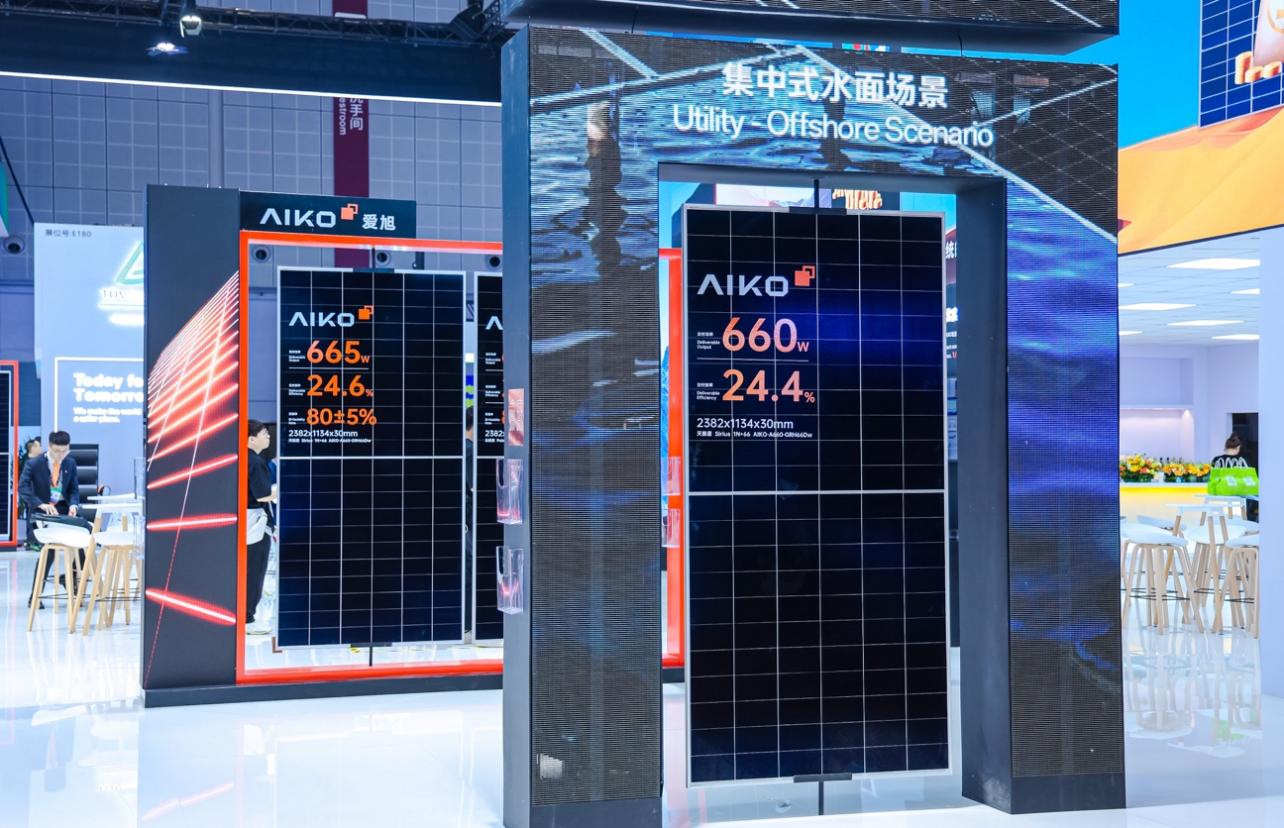 此次参展,爱旭携全面升级ABC组件产品亮相展台,户用、工商业、地面电站、水面电站产品均在原有高效ABC组件基础上,根据应用场景的差异化需求获得针对性提升:黑洞系列,78大版型满屏组件与54版型满屏组件“双剑合璧”,满足户用市场对面积与美观度的不同偏好;慧星系列,72版型满屏组件与星云系列54版型轻质组件“刚柔并济”,满足工商业屋顶对光伏组件效率、安全的严苛要求;恒星系列,天狼星组件通过应用无银金属化涂布等技术,显著提升组件抗隐裂能力,无惧海浪冲击,北极星组件将ABC组件双面率提升至80±5%,综合功率在领先优势上再进一步……众“星”辉映,共同闪耀展会现场,吸引众多观展人士驻足问询。