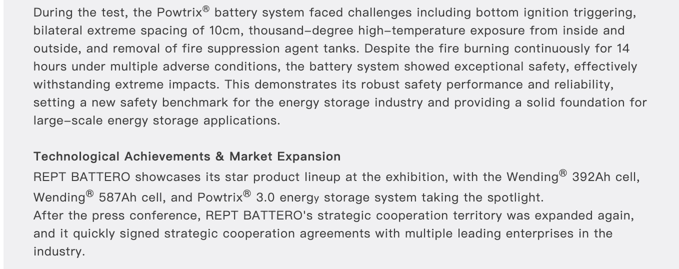 瑞浦兰钧于展会首日现场宣布,其邻舱全电量满配满充5MWh的Powtrix®储能电池舱成功通过 CSA/ANSI C800极端安全测试。
