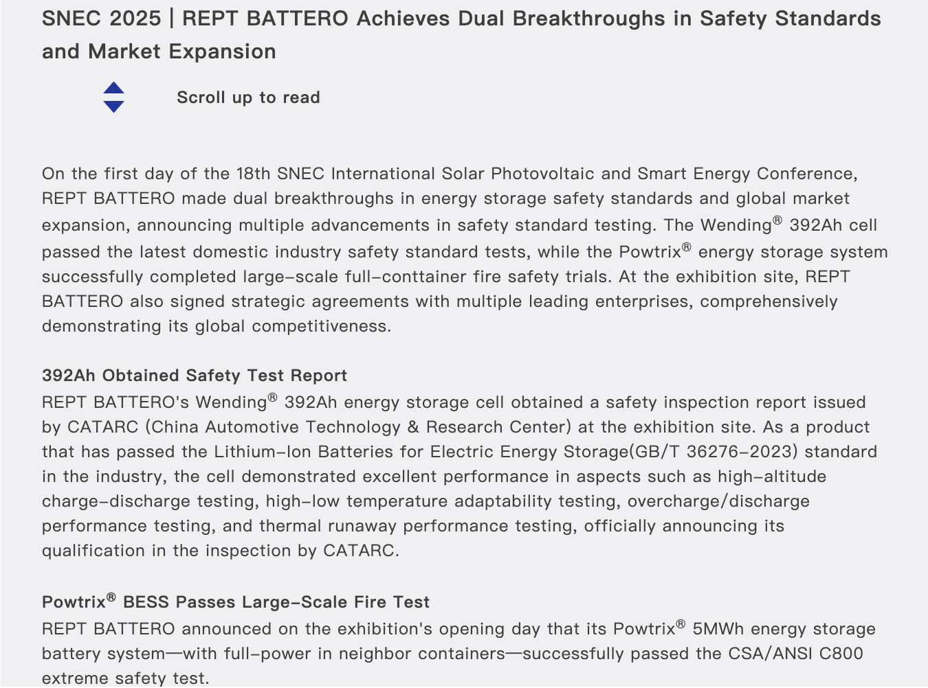 第十八届SNEC国际太阳能光伏与智慧能源大会首日,瑞浦兰钧在储能安全标准与全球化市场拓展上实现双重突破,公布多项安全标准测试进展。问顶®392Ah电芯通过国内最新安全标准测试,Powtrix®储能系统通过大规模整舱火烧安全试验。展会现场,瑞浦兰钧同时与多家头部企业达成战略签约,全方位展现瑞浦兰钧的全球竞争力。