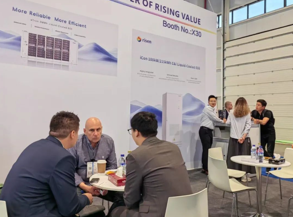 储能方面,东方日升同步展示的eTron 5MWh液冷储能系统,与伏曦Pro形成高效协同。该系统采用五重安全防护机制,从电芯级安全、BMS实时监控、PCS精准调控,到“金盾”智能预警系统,构筑了全面稳定的安全体系,已通过UL、IEC等国际权威认证。系统可实现高效电力存储与智能调度,显著提升电站整体运行效率,助力区域电网调峰与能源平衡。在光储协同运行模式下,该解决方案更能充分发挥优势,实现电力资源的优化配置。充分适应当地极端气候与调峰需求,展现出强大应用潜力。而iCon 100kW/215kWh工商业液冷储能一体机则专为中小型工商业场景设计,体积小巧、安装便捷,搭配东方日升自主研发的Risen Cloud智能管理平台,可对整个系统进行实时监控与智能调控,确保系统始终处于最佳运行状态,为工商业用户提供了安全、可靠、高效的能源管理方案。