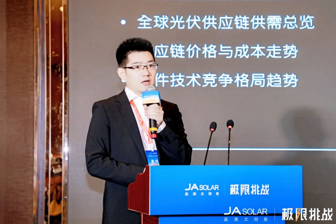 在本次沙戈荒专场论坛中,国家发展和改革委员会能源研究所可再生能源中心副主任陶冶、InfoLink Consulting光伏研究负责人赵祥、中国科学院西北生态环境资源研究院研究员柳本立、龙源新能源设计院项目技术专家、内蒙古电力勘测设计院新能源公司主设田强、可再生能源开发商 ACWA Power 朱召义及晶澳科技产品部负责人分别带来了各自领域的最新研究成果,共同破解沙漠光伏应用的世界性难题。
