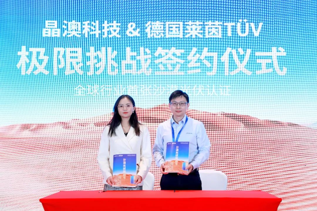 完成此次挑战后,在本次论坛上,晶澳科技再与TÜV莱茵签订挑战书,针对全球首张沙漠光伏组件认证展开挑战。TÜV莱茵围绕沙漠极端环境的光伏组件应用,设置了全新测试方案,包含多项加严测试序列,如温度循环、高强度紫外辐射、干热、吹沙和侵蚀磨损、高温热斑、综合测试等。此系列测试相较IEC标准皆有不同倍数级增强。
