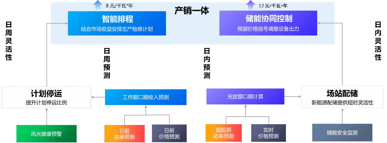 其次,“136号文”出台后,风电交易运行维检的模式,将从过去的运行和维检两班协同,变为交易、运行、维检三班协同,产销一体。未进现货的场站,新能源的交易和生产是“两张皮”,价格信号无法引导新能源出力,进而缓解电力供需平衡。但在现货风场,如下图所示,风场的计划停运具备日周级别的灵活性,可以响应价格信号,特别是机组大型化后,对出力的影响不断增大,灵活响应价格信号的能力愈发重要。最大化利用灵活性优势,需要日周级别的功率预测与价格预测,赋能工作窗口期预测,给计划停运智能排程。“136号文”同时利好存量储能的调用。配置了表后储能的风场,具备日内级别的灵活性,最大化利用灵活性优势,需要日内的功率预测和价格预测,合成充放电窗口期的预测,结合风储协同实时控制响应价格信号出力。远景在山东实践的产销一体风场,年收入提升了20元/千瓦。在这个过程中,检修班基于全面的大部件预警,将更多的计划停运传递到运行班,运行班再将计划停运与功率预测结合,传递给交易员;交易员则将周前价格预测和上报后出清的日前价格信号,传递给运行班和检修班用于排程。在“集控3.0:产销一体集控”软件的支撑下,三班协同几乎没有增加工作量。